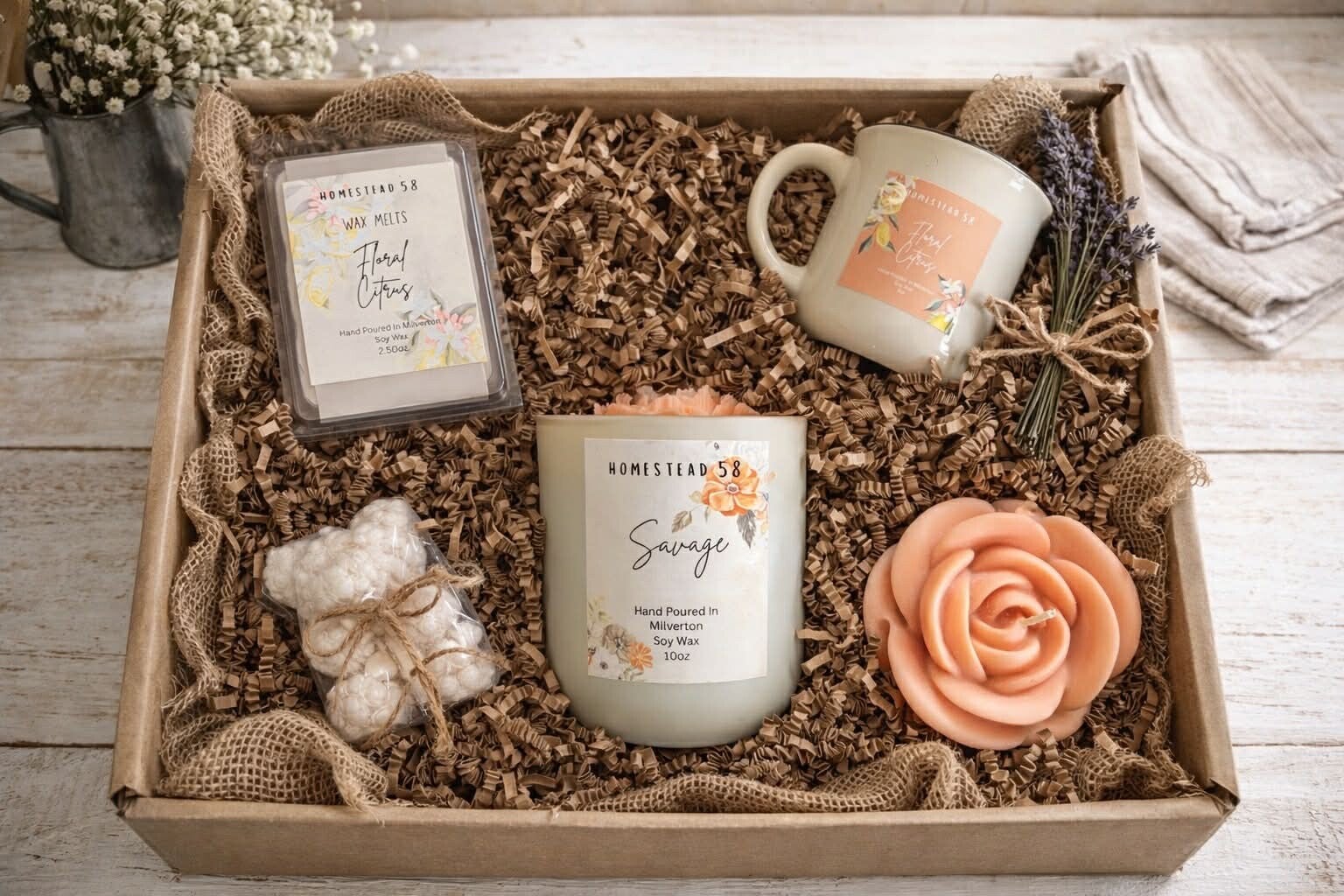 Discover the perfect gift with Homestead 58's unique gift baskets! We pride ourselves on creating memorable and personalized experiences. Our gift baskets are filled with hand-poured soy candles and products from other stay-at-home mom-run businesses. We also offer custom gift baskets with products of your choice. Explore our options and let us help you create the perfect gift!