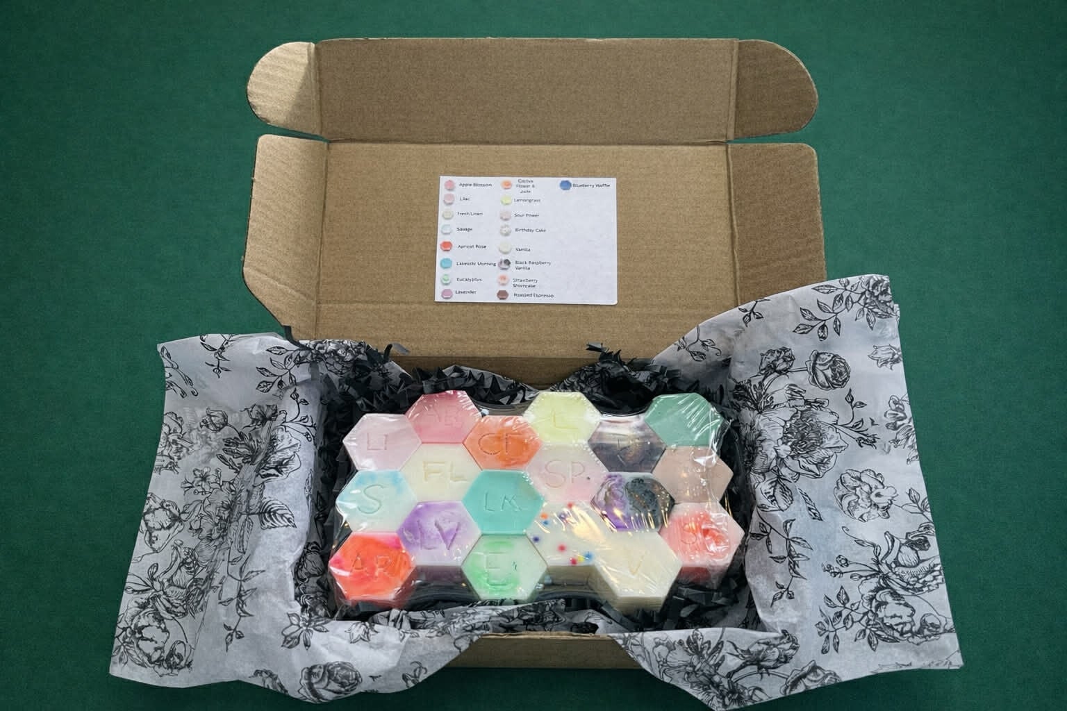 Each box includes a curated collection of hand-poured soy wax scent samples, allowing you to explore many of our signature fragrances in one convenient set.